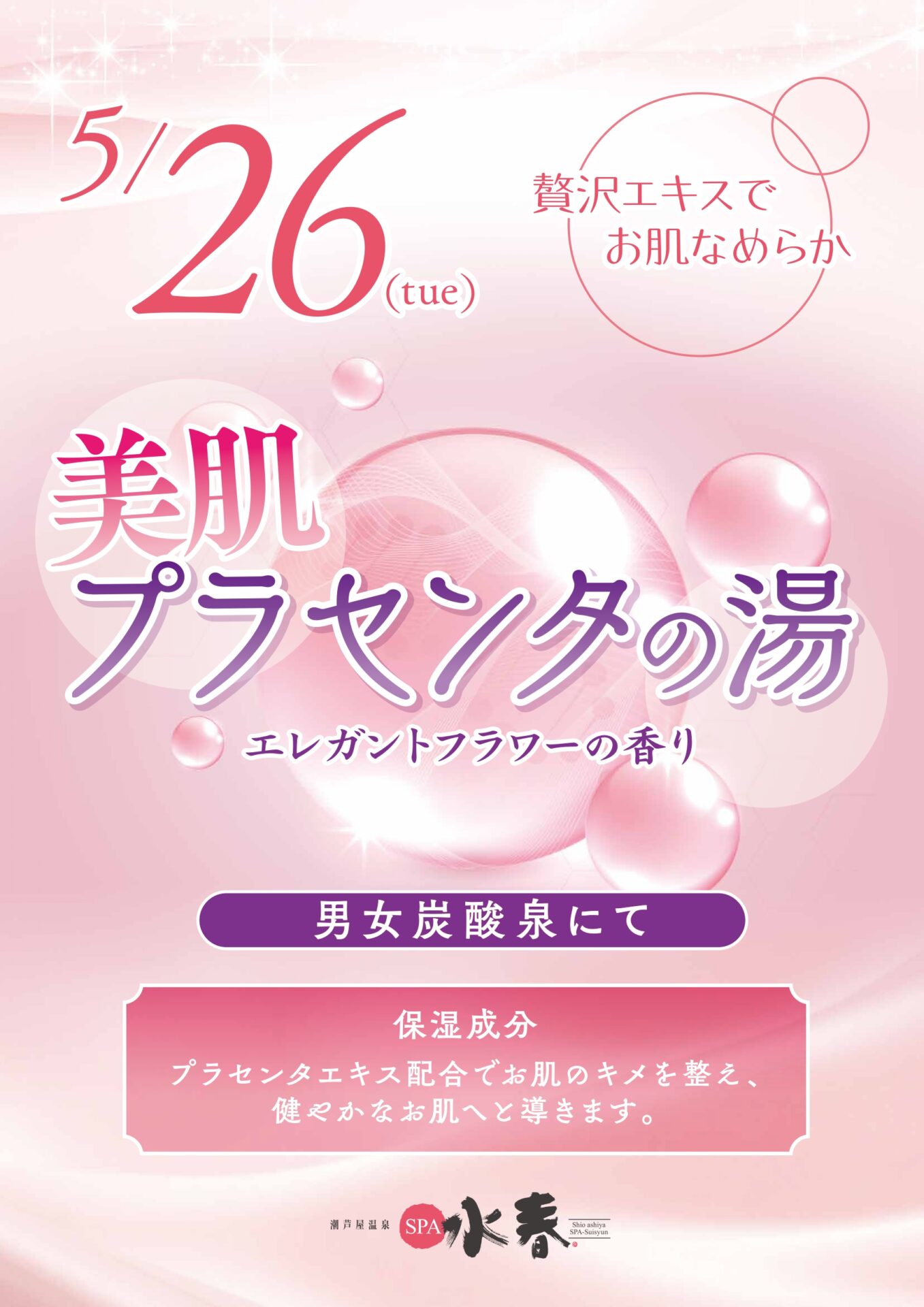 5/26(火) 男女炭酸泉にて美肌プラセンタの湯を開催します♬
