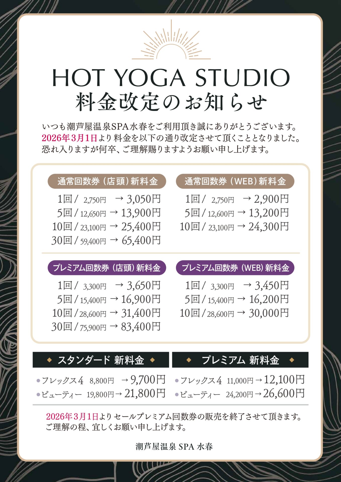 芦屋水春ホットヨガ料金改定のお知らせ