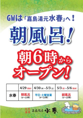 GW朝風呂営業 朝6時オープン! 2025.04.19 GWも休まず営業!朝風呂実施! GWの朝風呂実施期間は4月29日(祝火)・5月3日(祝土)~6日(祝火)です。朝6時より営業いたします! ぜひ、嘉島湯元水春の温泉、サウナ、岩盤浴でおくつろぎください😊 Post Share Hatena LINE RSS feedly Pin it note 5/25~5/31 ガラガラ抽選会 前の記事 5月 B-fit入会キャンペーン 次の記事