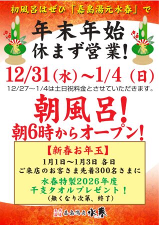 年末年始朝風呂営業のご案内 2025.11.19 嘉島湯元水春は年末年始も営業!! 12/31(水)~1/4(日)は6:00オープンの 朝風呂営業!!! 12/27~1/4(日)までは 土日祝料金にて営業しております Tweet Share Hatena Pocket RSS feedly Pin it 大晦日じゃんけん大会 前の記事 クリスマスイベント 次の記事