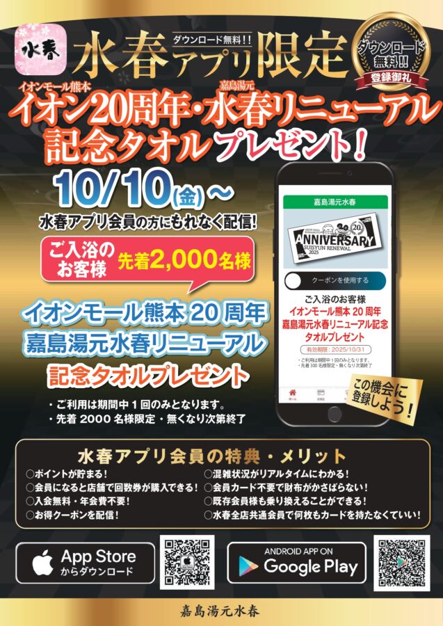 10/10~ 記念タオルプレゼント - 熊本の温泉 嘉島湯元水春