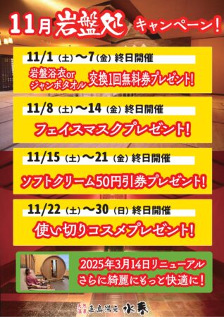岩盤浴衣orジャンボタオル無料交換券プレゼント - 11月8日(土)~14日(金)