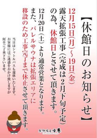 ★休館日のお知らせ★ 2025.11.1 12月15日(月)~19日(金) 露天拡張工事(完成は2月下旬の予定)の為、 休館日とさせていただきます。 12月20日(土)より通常営業となります。 当日はシャトルバスも運休致します。 お客様にはご迷惑をお掛け致しますが、何卒ご了承下さいませ。 Tweet Share Hatena Pocket RSS feedly Pin it 11月イベントカレンダー 前の記事 Hot Yoga Studio aina 11月レッスンプログラム 次の記事