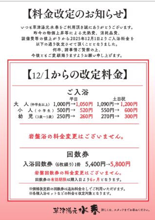 2025年12月1日よりご入浴料金を画像の通り改定させて頂くことになりました。