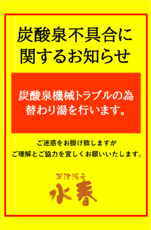 復旧までの間、炭酸泉風呂にて替わり湯を開催いたします。