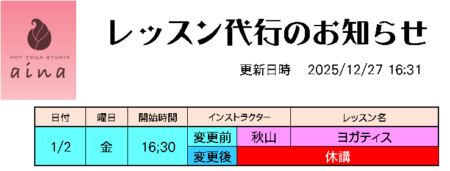 Hot Yoga Studio aina 1月 レッスン代行のお知らせ 2025.12.27 Hot Yoga Studio ainaレッスン代行表 下記のレッスン内容・インストラクターに変更がございます。 レッスンのご予約・受講の際はお間違えの無いようにお気を付けくださいませ。 Tweet Share Hatena Pocket RSS feedly Pin it 1月イベントカレンダー 前の記事 Hot Yoga Studio aina 1月レッスンプログラム 次の記事