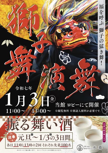 1/3(金) 獅子舞がやってくる!2024.12.10日 時2024年1月3日11時と13時場 所1階ロビーにて観覧は無料ですが、入館料は必要です。獅子は人にとりついた邪気を食べる性質があると言われているため、頭にかみついてくることがあります。獅子に噛まれると邪気が取り除かれるので、病気などの災難から守られることになります。獅子に噛まれるのは怖いことではなく、喜ばしいことだそうです。子どもが獅子に噛まれると無病息災で成長することが期待できるほか、学力向上のご利益もあると言われております。 Post Share Hatena LINE RSS feedly Pin it note 1/1(水)~1/3(金) 白鹿の湯 前の記事 1/4(土)~1/5(日)テントサウナ第6弾開催! ~岩盤処テラスにて~ 次の記事