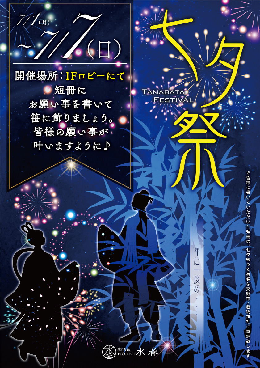 七夕祭り2024.06.10七夕祭り水春で短冊に願い事を!皆様の短冊は七夕祭りで有名な機物(はたもの)神社に奉納致します。期 間7/1(月)~7/7(日)開催場所ロビーにて開催 ~感染対策のご協力とお願い~①ご来館の際は、マスクの着用は任意になります。 ②ご来館時は検温と手指消毒のご協力をお願い致します。 ③浴場では、大声での会話はお控え下さい♨️ ④館内主要箇所にもアルコールを設置しております‼︎ ⑤サウナ内ではお静かにお願いいたします。 Post Share Hatena LINE RSS feedly Pin it note 7/14(日) 男性限定 かき氷シャンプー配付 前の記事 7月 ロビーコンサート 次の記事