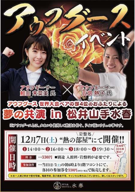 12/7 アウフグースイベント STEAM♡TWINS ご来店2024.12.2アウフグースイベント12月7日(土)に五塔熱子さん&鮭山未奈美さんによる最強タッグSTEAM♡TWINSがご来店されます。開催日・時間・12月7日(土)◎ 岩盤処にて ①14:00~/② 16:00~/③ 18:00~/④19:30~ 各時間40名様限定!参加条件当日12/7(土)の朝6時より1Fフロントにて、各回の参加券を330円(1回分/税込)で販売します。※お一人2枠まで受付可能 ※電話予約は不可※キャンセル待ちなし ※返金はできません Post Share Hatena LINE RSS feedly Pin it note 12月の水春おすすめマンガ 前の記事 【水春亭】冬の期間限定 おすすめメニュー 次の記事