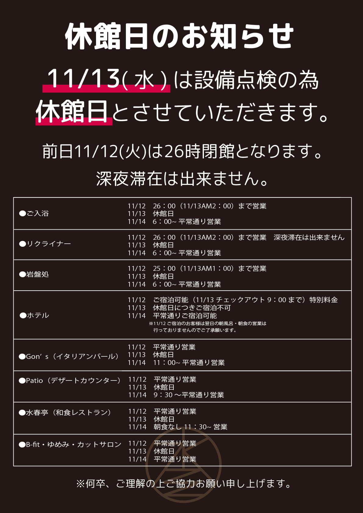 11/13(水) 休館日のお知らせ2024.04.24休館日のお知らせ11月13日(水)は設備点検の為、休館日とさせていただきます。前日の11月12日(火)は26時閉館となります。 深夜滞在はできません。ご迷惑をお掛けいたしますが、 何卒、ご理解・ご協力をお願いいたします。 Post Share Hatena LINE RSS feedly Pin it note 5月 ロビーコンサート 前の記事 5/1(水)~5/12(日) 家族の似顔絵大募集 次の記事
