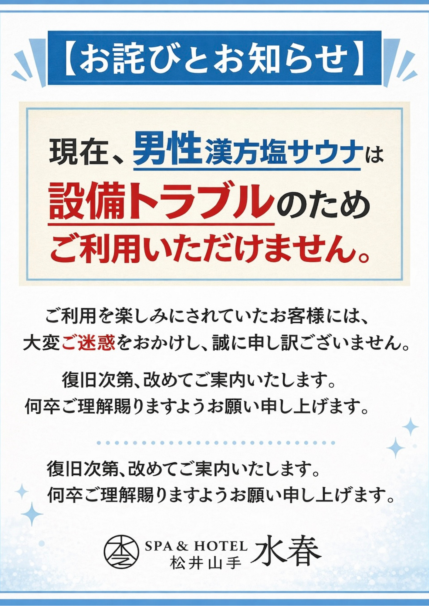 現在、男性 漢方塩サウナは設備トラブルのためご利用いただけません。