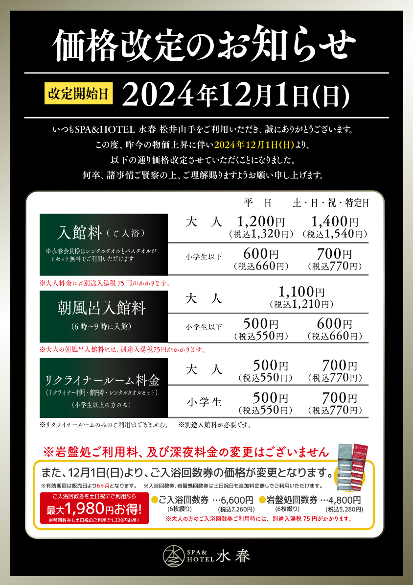 いつもSPA&HOTEL水春松井山手をご利用頂き、誠にありがとうございます。