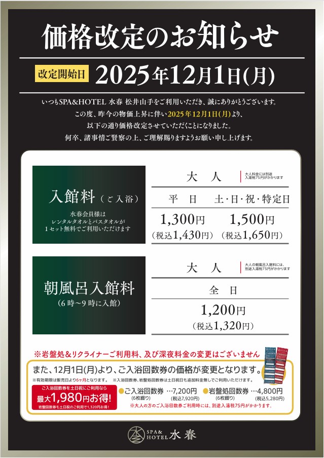 いつもSPA&HOTEL水春松井山手をご利用頂き、誠にありがとうございます。