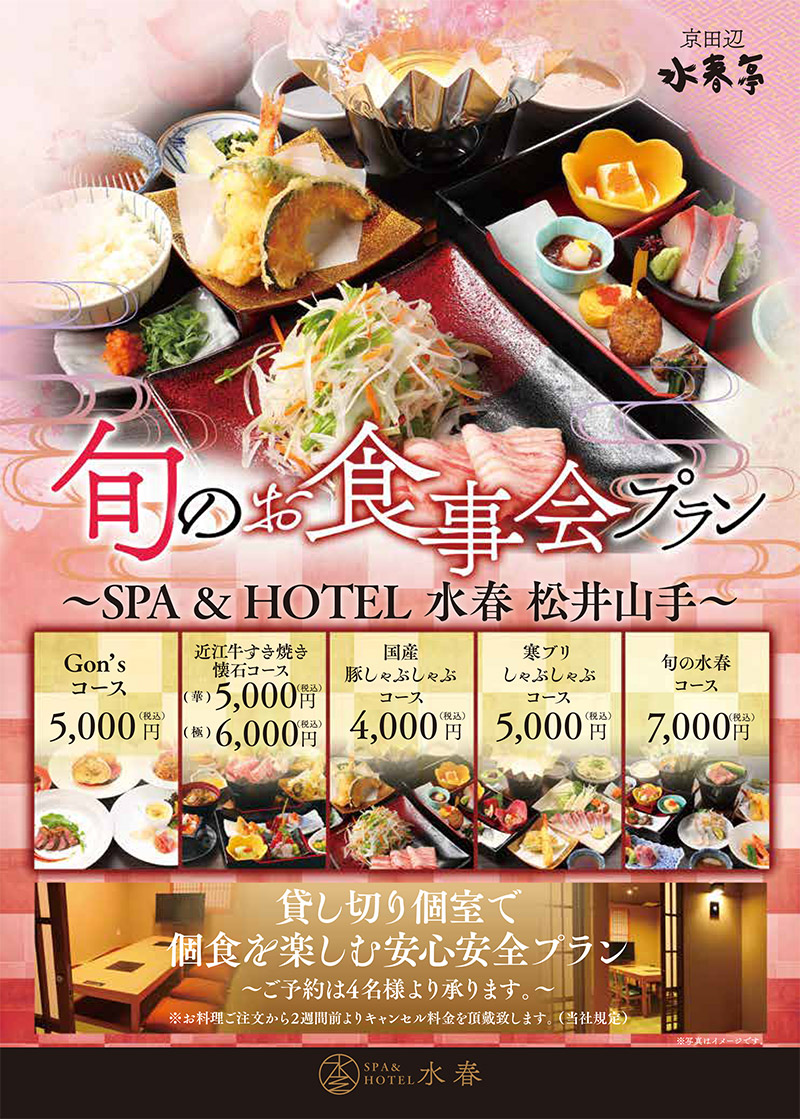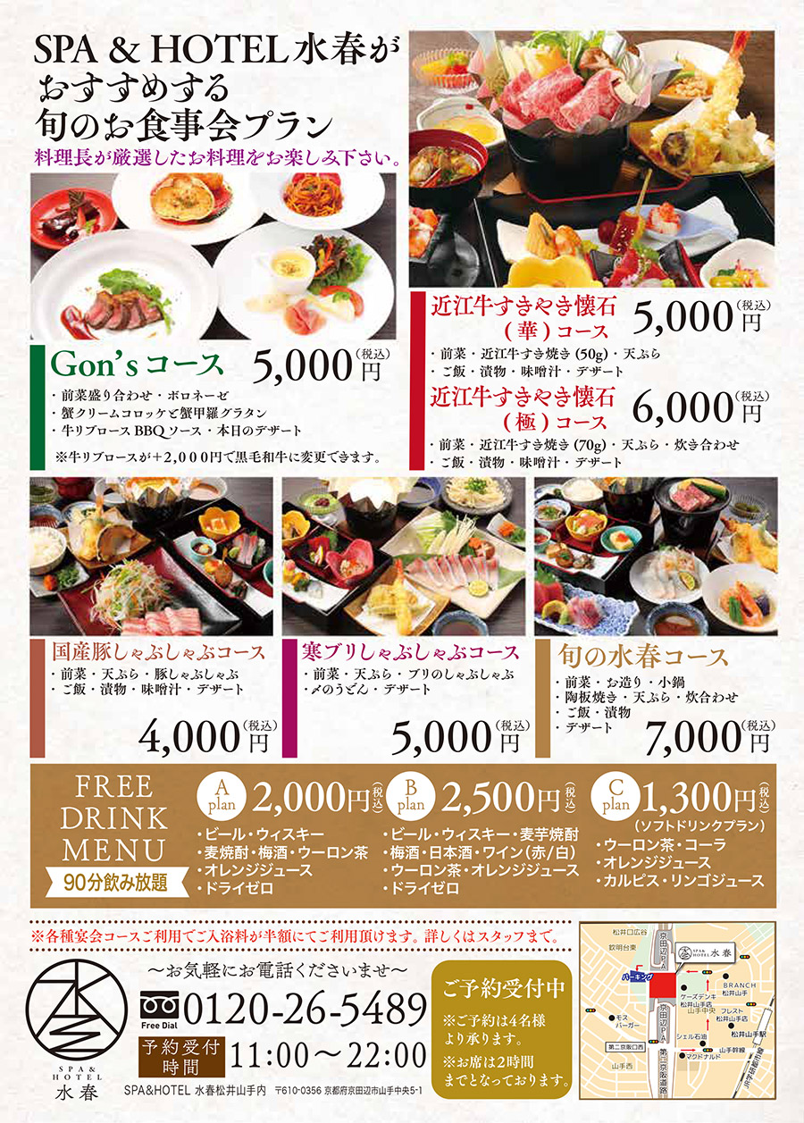 宴会プランをご利用のお客様は水春の温泉利用料(入浴料金)が半額となります。