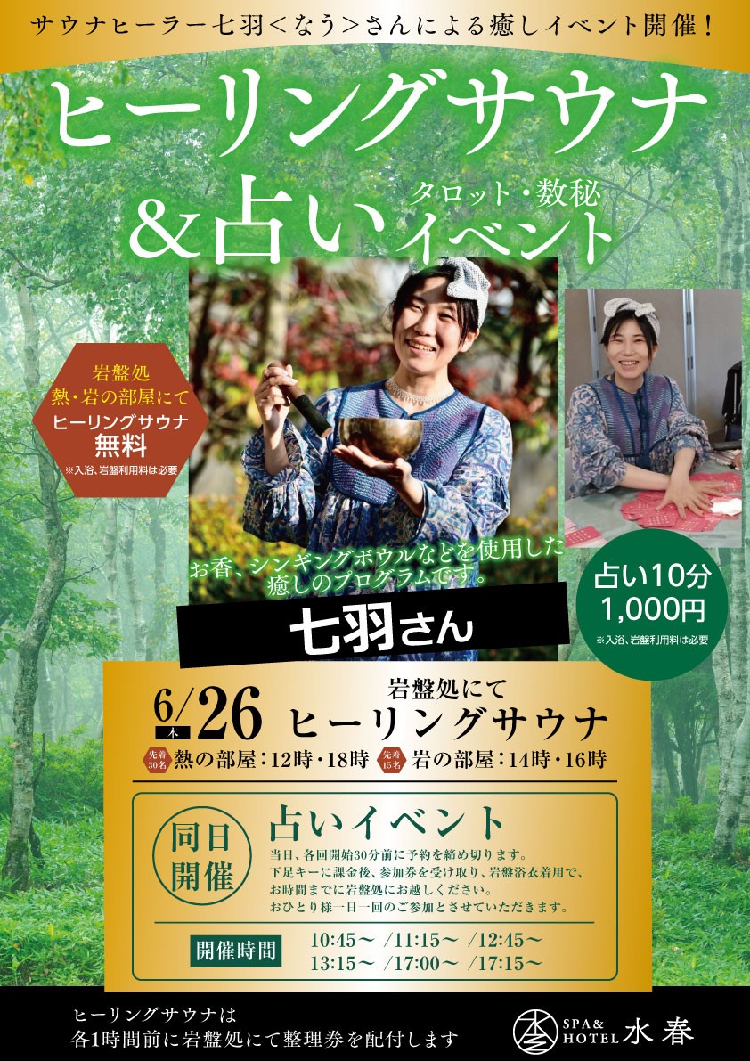 6/26(木)七羽さんによるヒーリングサウナ&占いイベントを開催致します!