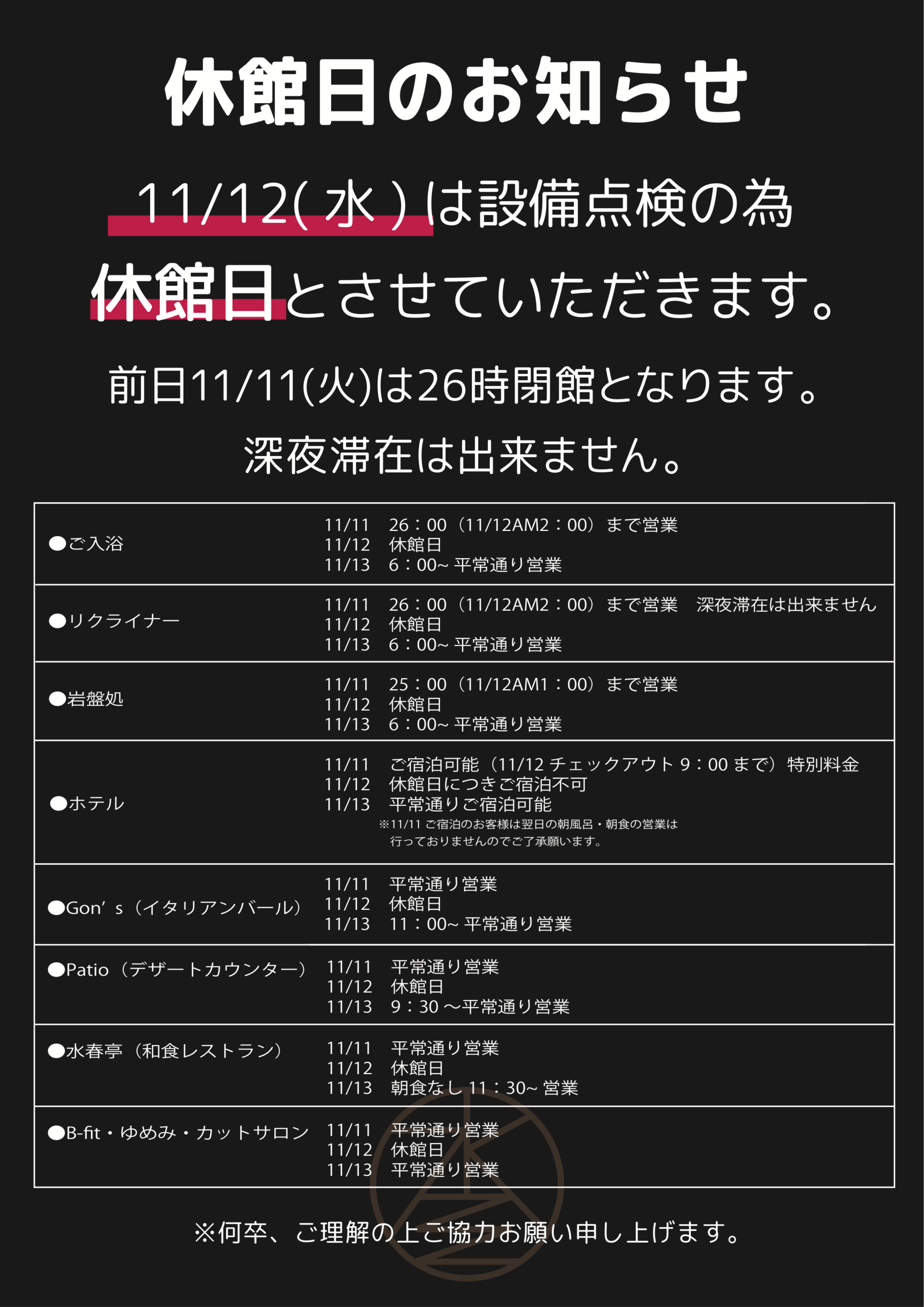 11月12日(水)は設備点検の為、休館日とさせていただきます。