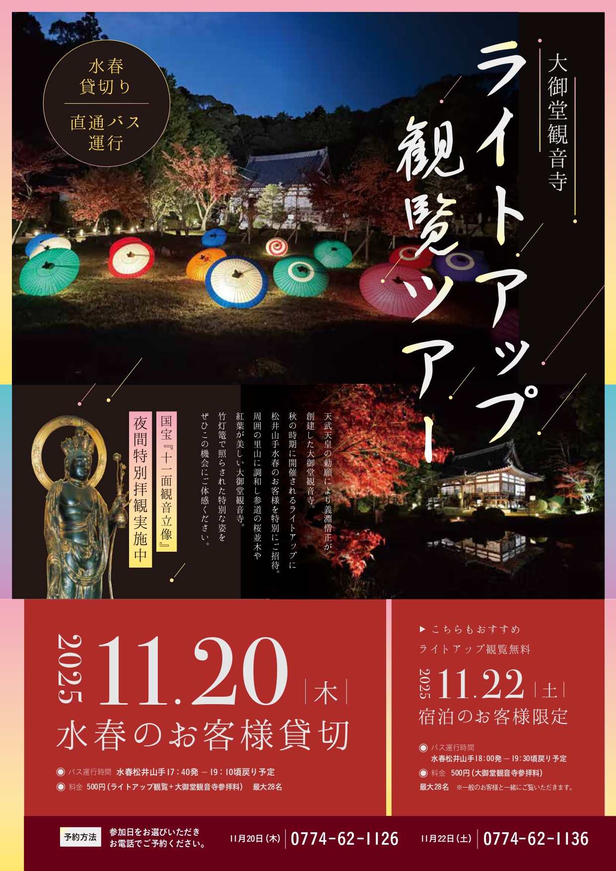 🚌 バス出発(各日 定員28名) ・11/20:水春松井山手発 17:40 / 帰着予定 19:10頃 ・11/22:出発 18:00 / 帰着予定 19:30頃