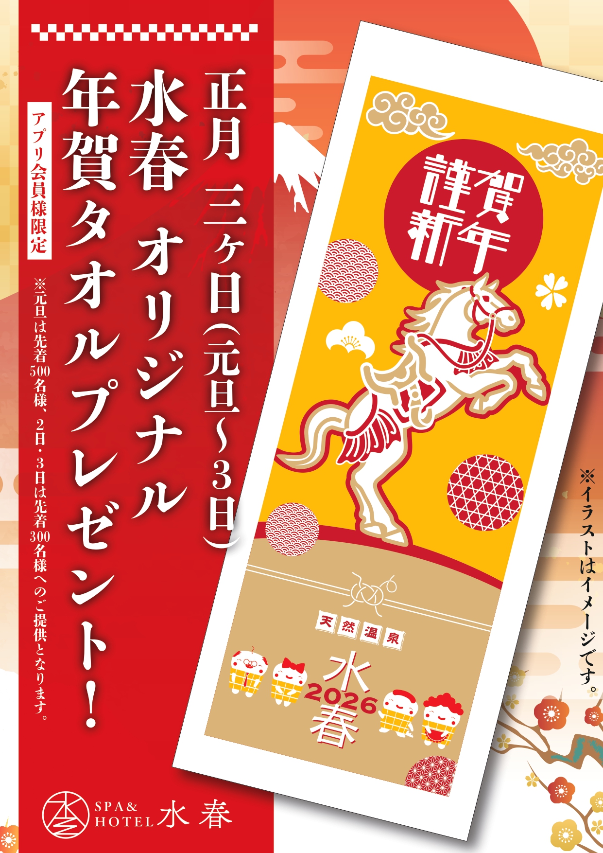 1/1(木)から1/3(土) 水春オリジナル年賀タオルプレゼント2025.12.24正月三が日水春オリジナル干支タオルプレゼント!アプリ会員様限定!※元旦は先着500名様 2日・3日は先着300名様への提供になります。 Post Share Hatena LINE RSS feedly Pin it note 1/1(木)から1/3(土)白鹿の湯開催! 前の記事 1/3(土)11:00~/13:00~ 獅子舞演舞! 次の記事