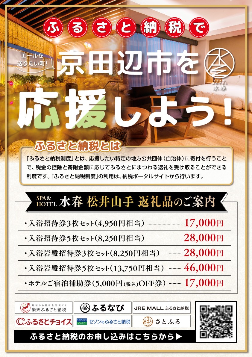 返礼品には温泉(お風呂)+岩盤浴がご利用いただける「入浴岩盤招待券」、ご宿泊+温泉(お風呂)がご利用いただける「ホテルご宿泊補助券」、