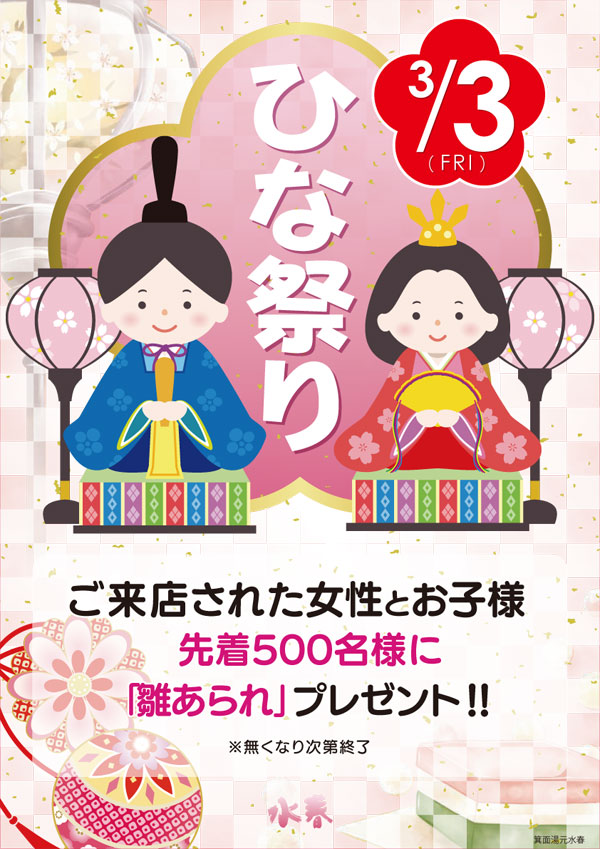 ご来店された女性とお子様先着500名様に、「雛あられ」をプレゼントいたします。