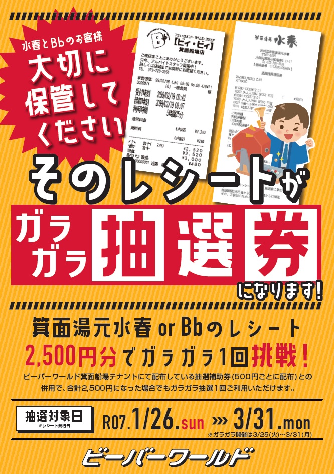 • 箕面水春とBbのレシートと、抽選補助券の併用も可能です。