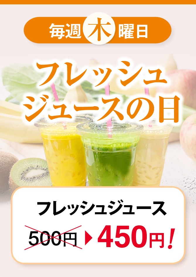 【木曜日】フレッシュジュースの日 2024.02.7 木曜日はフレッシュジュースがお得! 今月の木曜日はフレッシュジュースがお得です。 通常500円を450円でご提供いたします。 【金曜日】あかすりの日 前の記事 3月イベントカレンダー 次の記事
