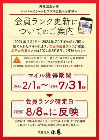 天然温泉水春のメンバーズカード&アプリ会員のお客様へ、会員ランク更新についてのご案内です。