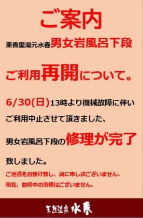 『東香里湯元水春』男女岩風呂下段、機械修理完了のご案内。