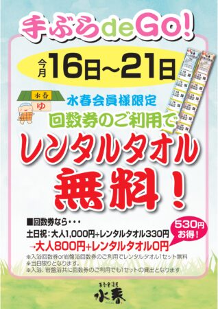 【水春会員様限定】回数券のご利用でレンタルタオル無料!