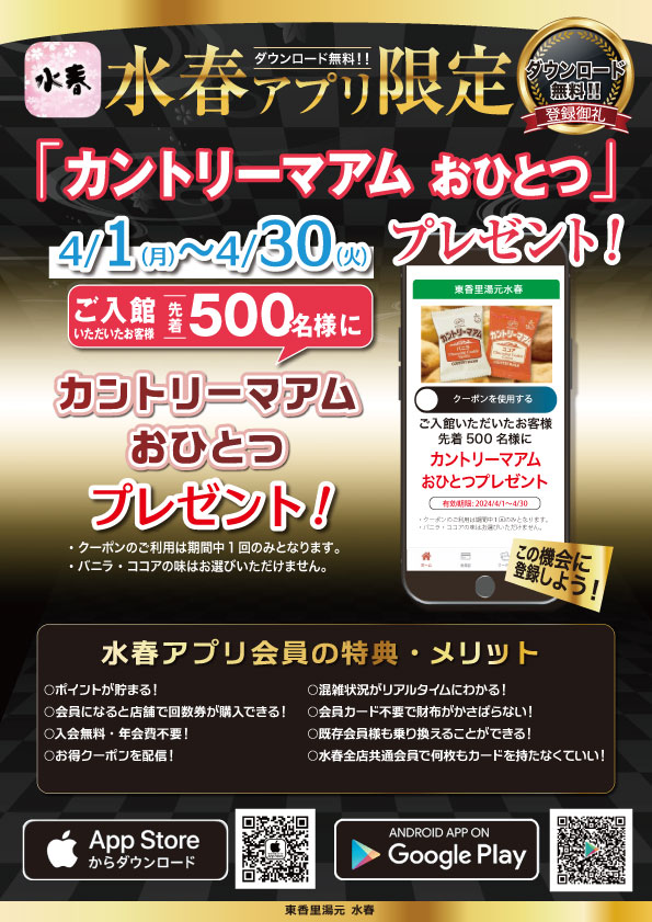 【水春アプリ限定】カントリーマアムおひとつプレゼント! 4/1(月)~30(火)