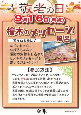 9月16日(月祝)の敬老の日は、男女ぬる湯にて「檜木のありがとう風呂」を開催いたします。