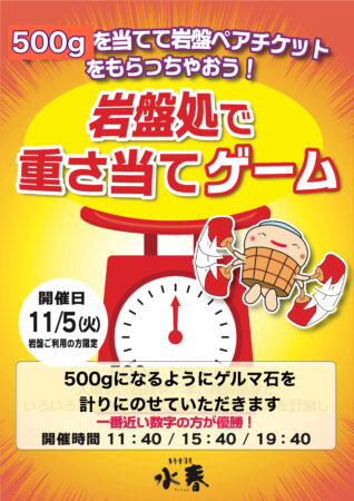 11/5(火)は、岩盤処にて「重さ当てゲーム」を開催します。