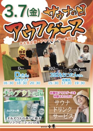 3/7(金)のサウナの日は、大人気のアウフグースをはじめとしたサウナイベントを開催いたします🔥