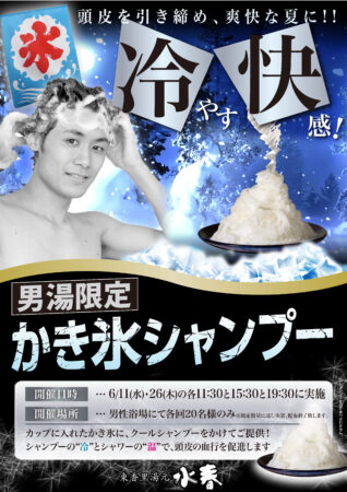 6/11(水)、6/26(木)は、男湯限定で1日3回、かき氷シャンプーを配布します。