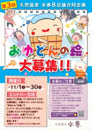 ~店内設置の応募用紙に、水春イメージキャラクター”おゆどん”を描いてエントリーボックスに投函してください。