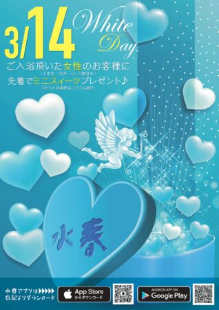 3/14ホワイトデー2026.01.28💛ホワイトデー💛3/14(土)はホワイトデー💛ですね。(^^♪当日ご入浴いただいた女性のお客様に先着で「ミニスィーツ」プレゼント!(※無くなり次第終了となります)💖皆様のご来店をお待ちしております!!💖 Post Share 3/3ひな祭り 前の記事