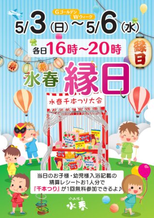 水春縁日「千本釣り大会」 GW開催2026.04.13水春縁日「千本つり大会」5/3(日)~5/6(水)の4日間各日16時~20時に開催致します(^^♪開催期間中当日のお子様・幼児様入浴記載の精算レシートお1人分で1回無料参加できます!! Post Share 水春スタッフおすすめ5月コミック 前の記事 菖蒲の湯 次の記事