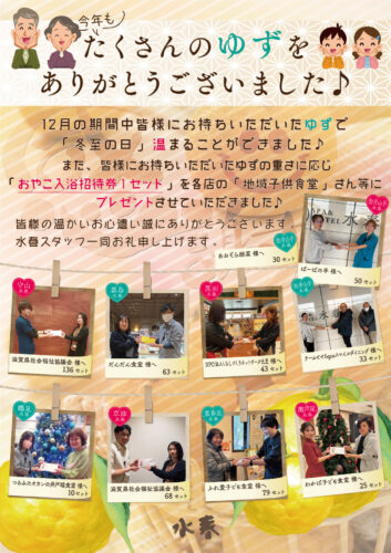 そのほか 2026.01.10たくさんのゆず、ありがとうございます!去年12月の期間中に開催致しました「温まりすぎます、あなたのゆずは」イベントで皆様から集めさせていただいた柚子で「冬至の日」のゆず風呂、温まることが出来ました!そして、お持ちいただいた柚子の重さに応じて「おやこ入浴招待券」を各店地域の「こども食堂」さんへプレゼントさせて頂きました!!!皆様のお心遣い誠にありがとうございます。水春スタッフ一同よりお礼も申し上げます。 Tweet Share Hatena feedly Pin it そのほか