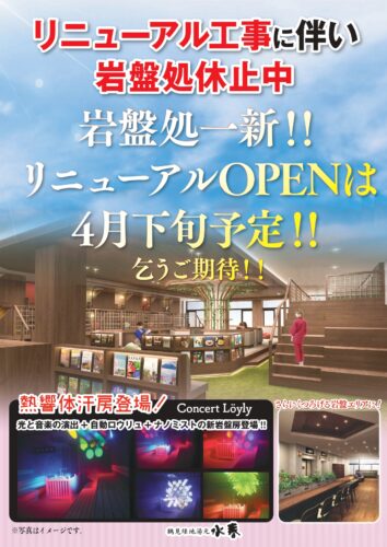 そのほか 2026.02.18岩盤処改装工事のお知らせいつもご利用いただき誠にありがとうございます。鶴見緑地湯元水春リニューアル工事のため2/16より岩盤エリアを先行休業とさせていただきます。お客様にはご不便をおかけいたしますが、何卒ご理解の程よろしくお願い申し上げます。 Tweet Share Hatena feedly Pin it そのほか